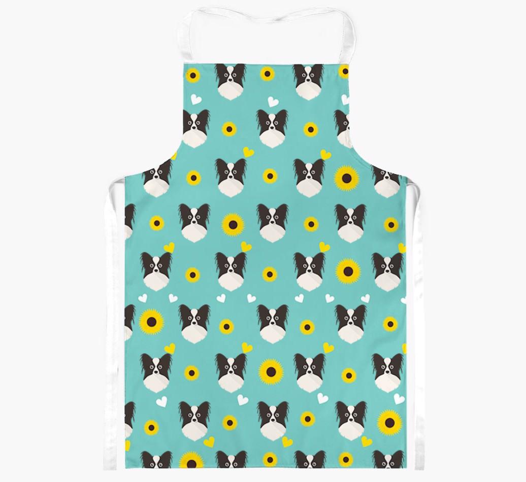 This apron has a delightful sunflower and heart pattern, and best of all - it's personalized with Papillon's face too! This cute and colorful apron is sure to put a smile on every dog lover's face.