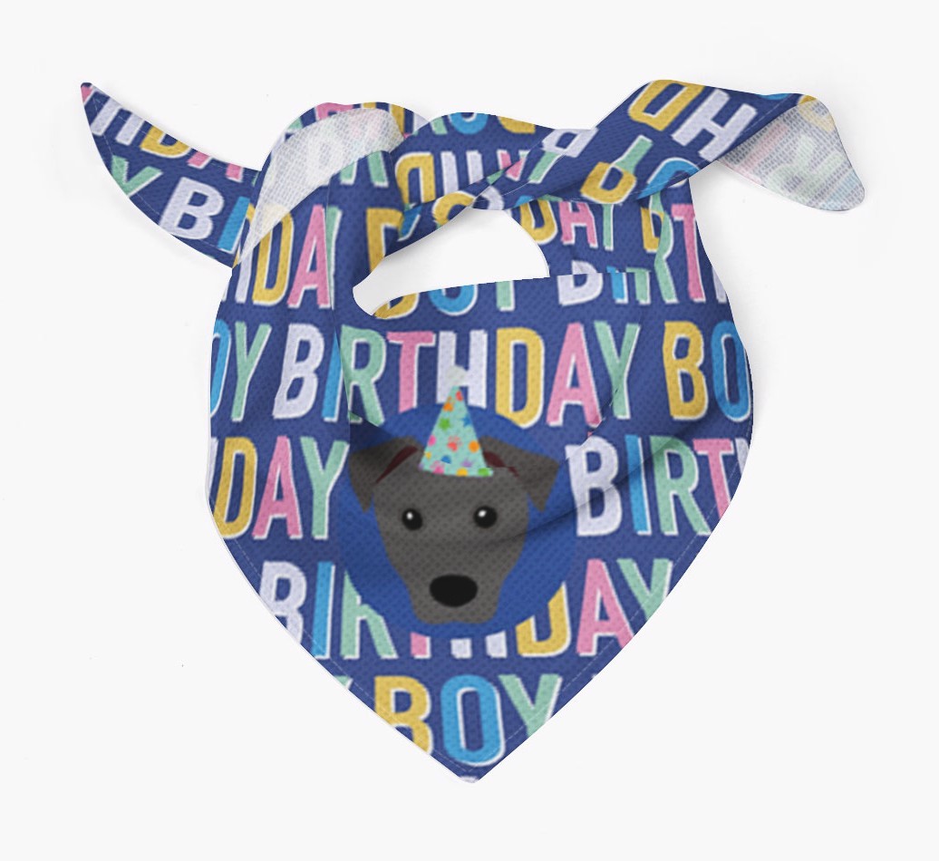 Featuring a colorful text pattern that reads 'birthay boy' and personalized with Patterdale Terrier's cute icon (complete with a fun party hat), your Patterdale will look simply pawgeous on their special day when they're wearing this bandana.