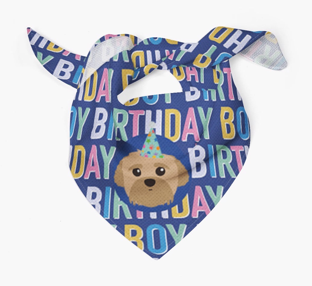 Featuring a colorful text pattern that reads 'birthay boy' and personalized with Peek-a-poo's cute icon (complete with a fun party hat), your Peek-a-poo will look simply pawgeous on their special day when they're wearing this bandana.