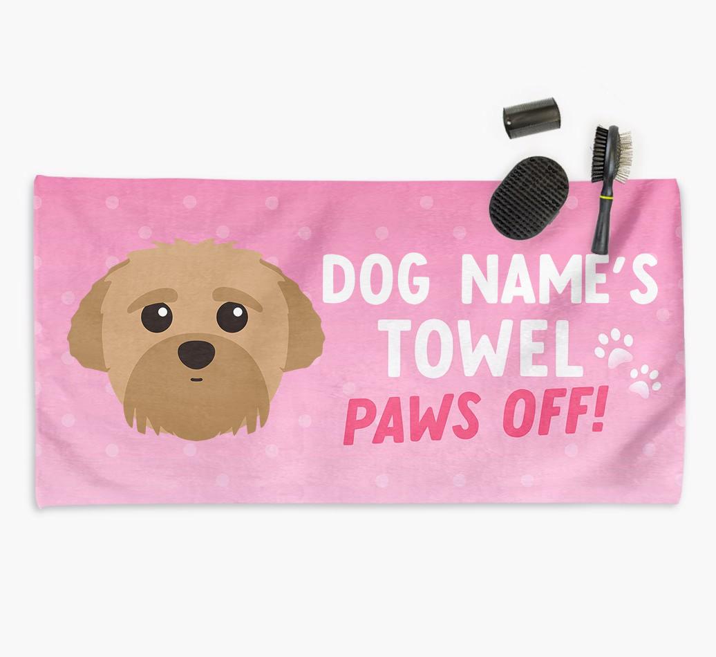 Perfect for messy pups and for pampering your Peek-a-poo at bathtime, this soft and absorbent towel is made for cleaning your mucky pup and drying them off in a flash. It's personalized with Peek-a-poo's name and icon and is printed with a message for everyone else to keep their paws off it!