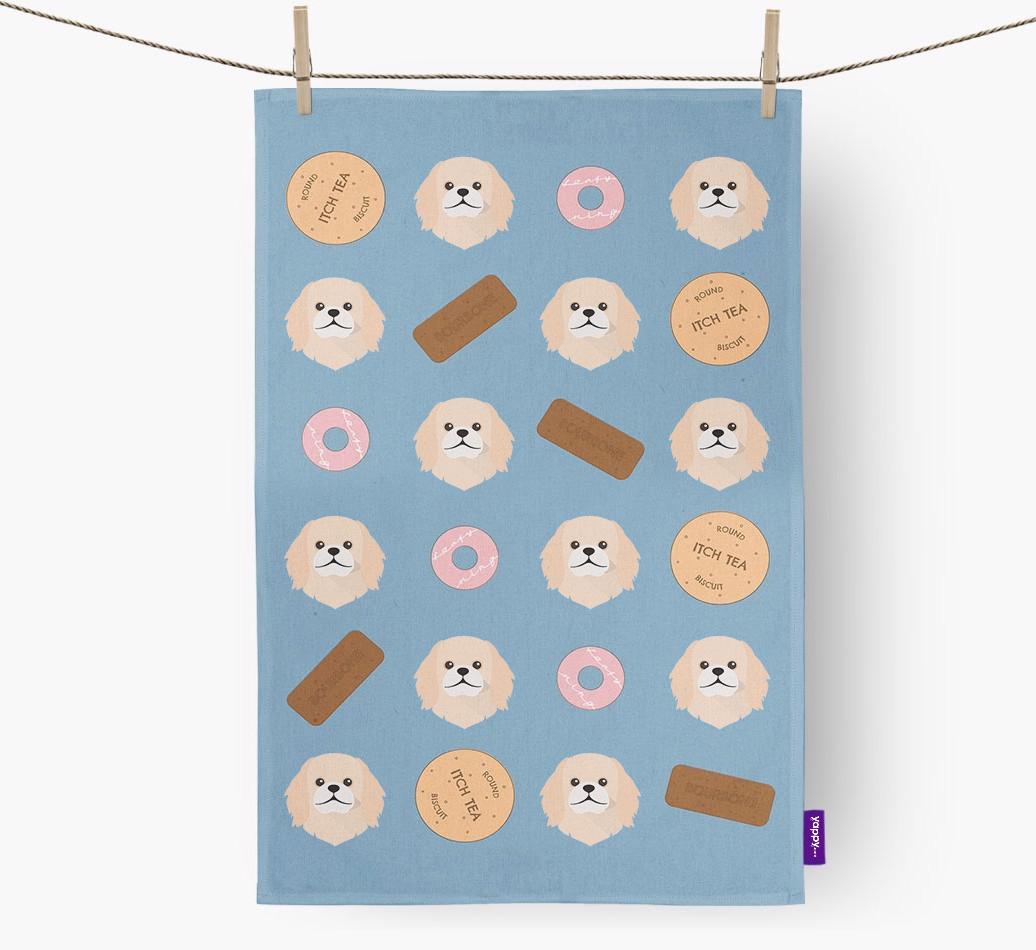 This woofly dish towel features Pekingese icons amongst some of our most loved cookies, it is available in four different colors and is sure to make you smile every time you see it.