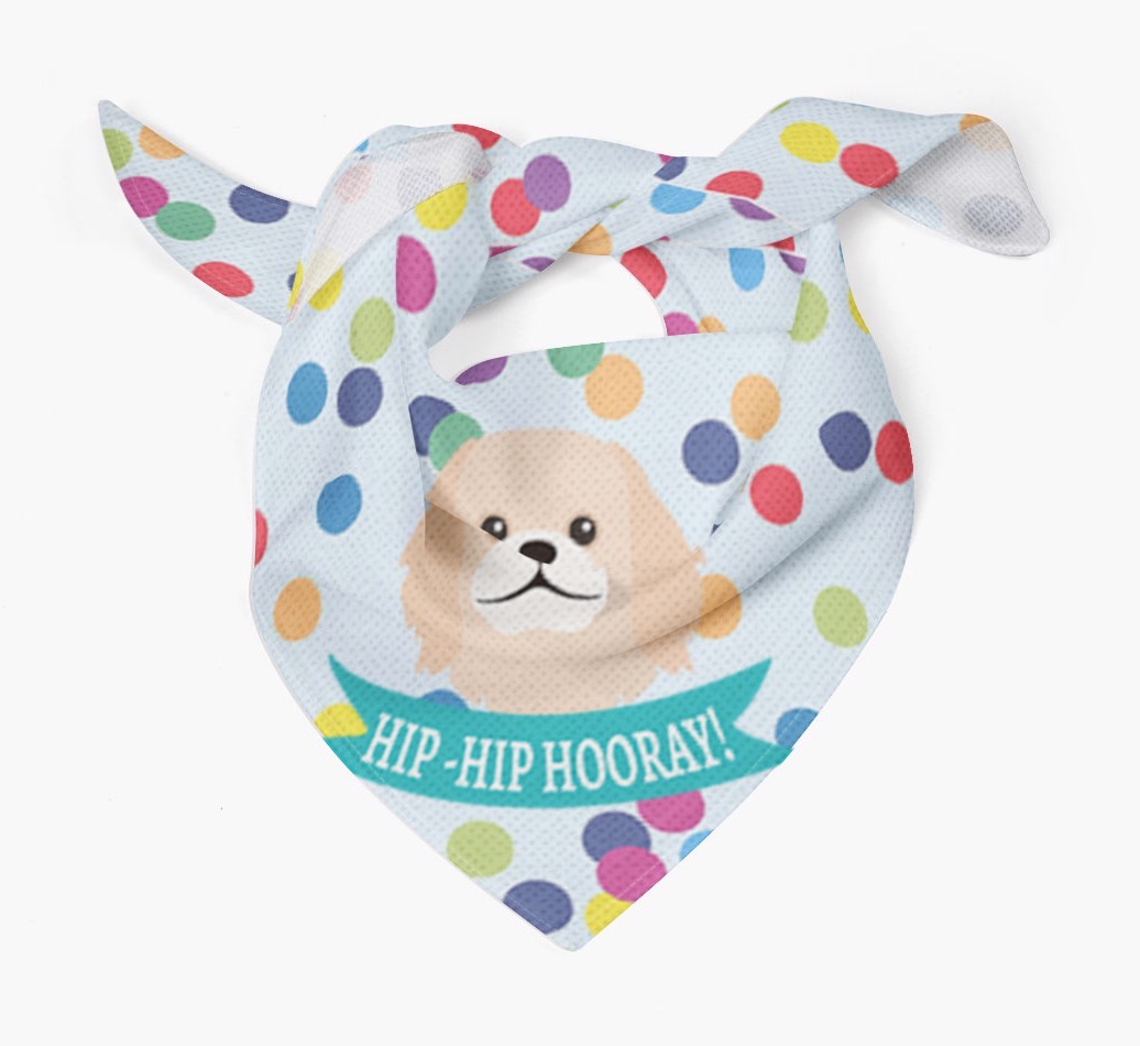 Featuring our famous Pekingese icon and the words ‘hip-hip hooray!’ printed upon a colorful confetti background, Your Pekingese is sure to look pawty ready wearing this bandana.