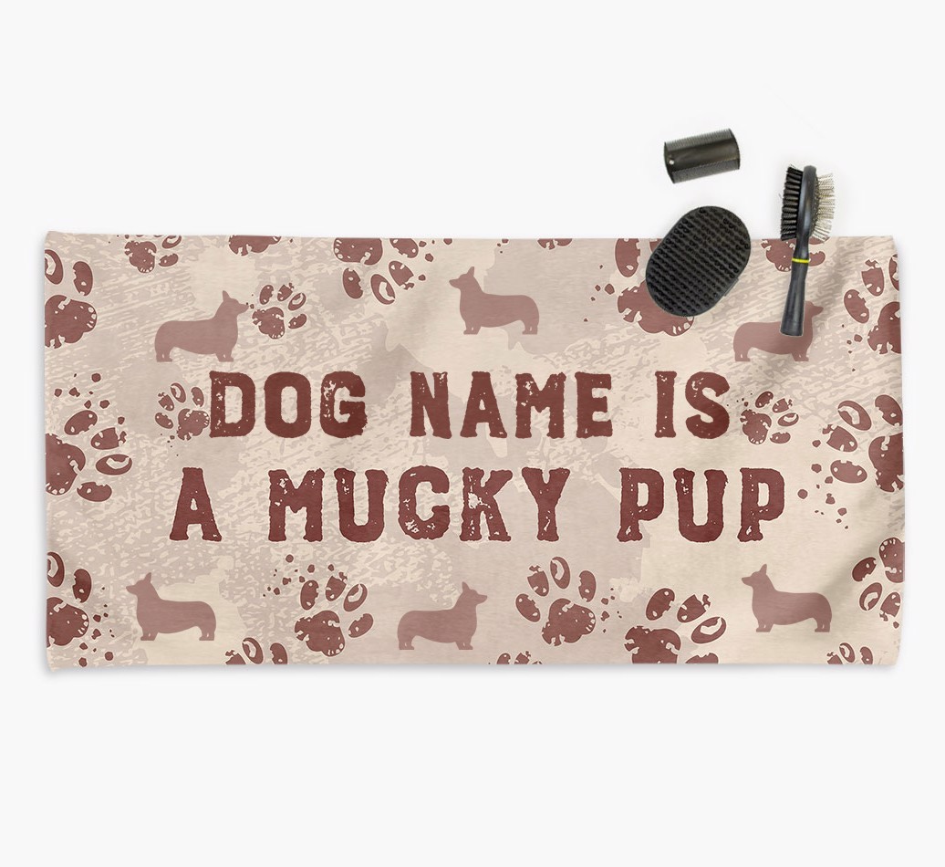 Soft and absorbent, simply wrap your mucky pup in this towel to dry them off in a flash. It features a muddy pawprint pattern and is personalized with Pembroke Welsh Corgi's name and silhouette to make it extra special.