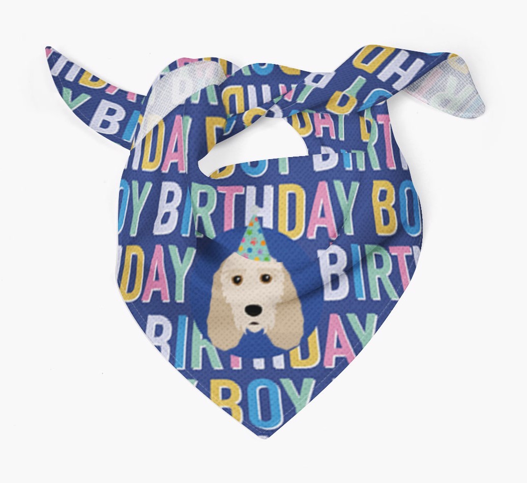Featuring a colorful text pattern that reads 'birthay boy' and personalized with Petit Basset Griffon Vendeen's cute icon (complete with a fun party hat), your Basset Griffon will look simply pawgeous on their special day when they're wearing this bandana.