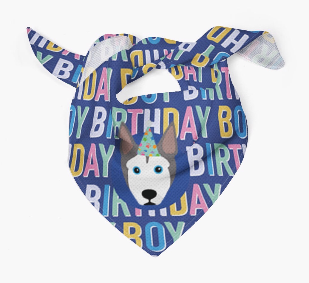 Featuring a colorful text pattern that reads 'birthay boy' and personalized with Pitsky's cute icon (complete with a fun party hat), your Pitsky will look simply pawgeous on their special day when they're wearing this bandana.