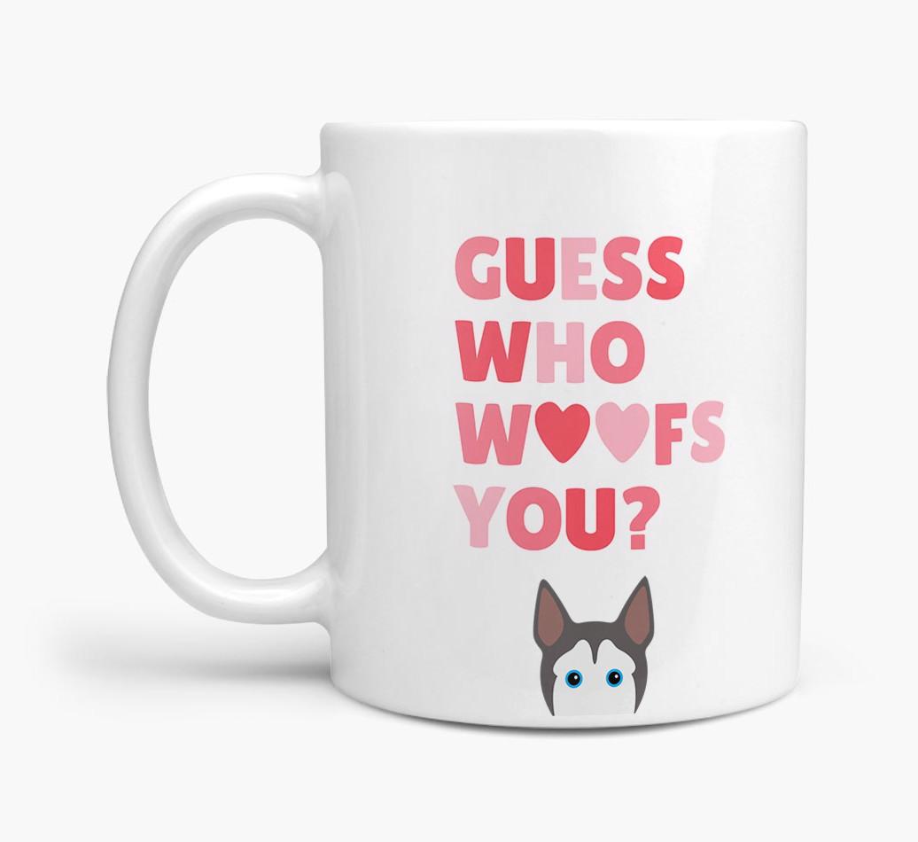 Personalized with Pitsky's cute face, this adorable mug is perfect for showing off the one who "woofs" you - how sweet!