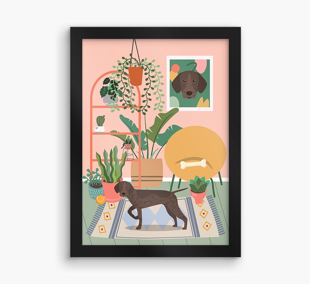 This contemporary piece of wall art pairs a chic living space with lovely pastel tones and a jungle of houseplants. Complete with the one that makes your house a home - Pointer! - this print is a wonderful way to display your love for your pooch.