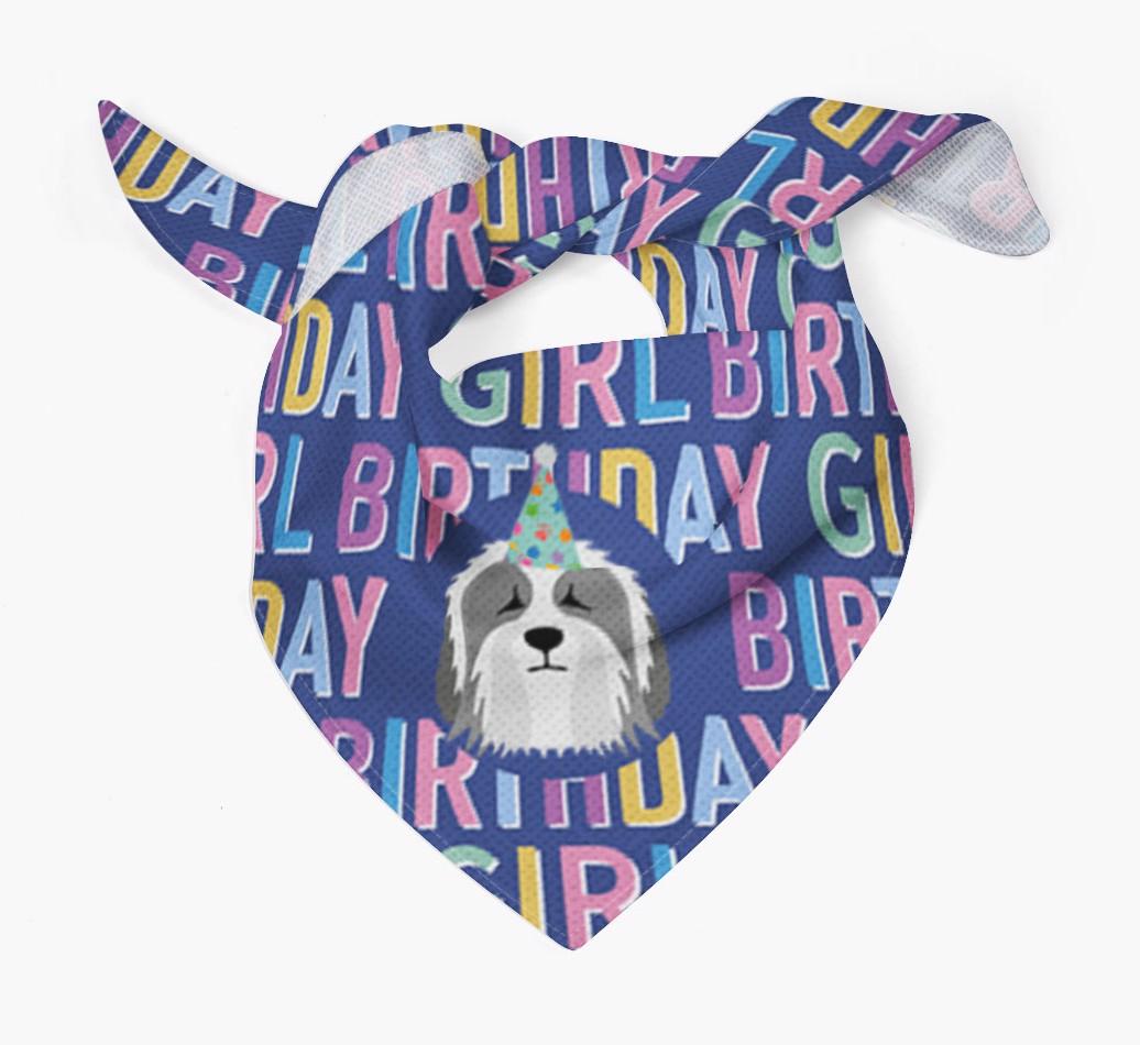 Featuring a text pattern that reads 'birthay girl' and personalized with Polish Lowland Sheepdog's cute icon (complete with a fun party hat), your Nizinny will look simply pawgeous on their special day when they're wearing this bandana.