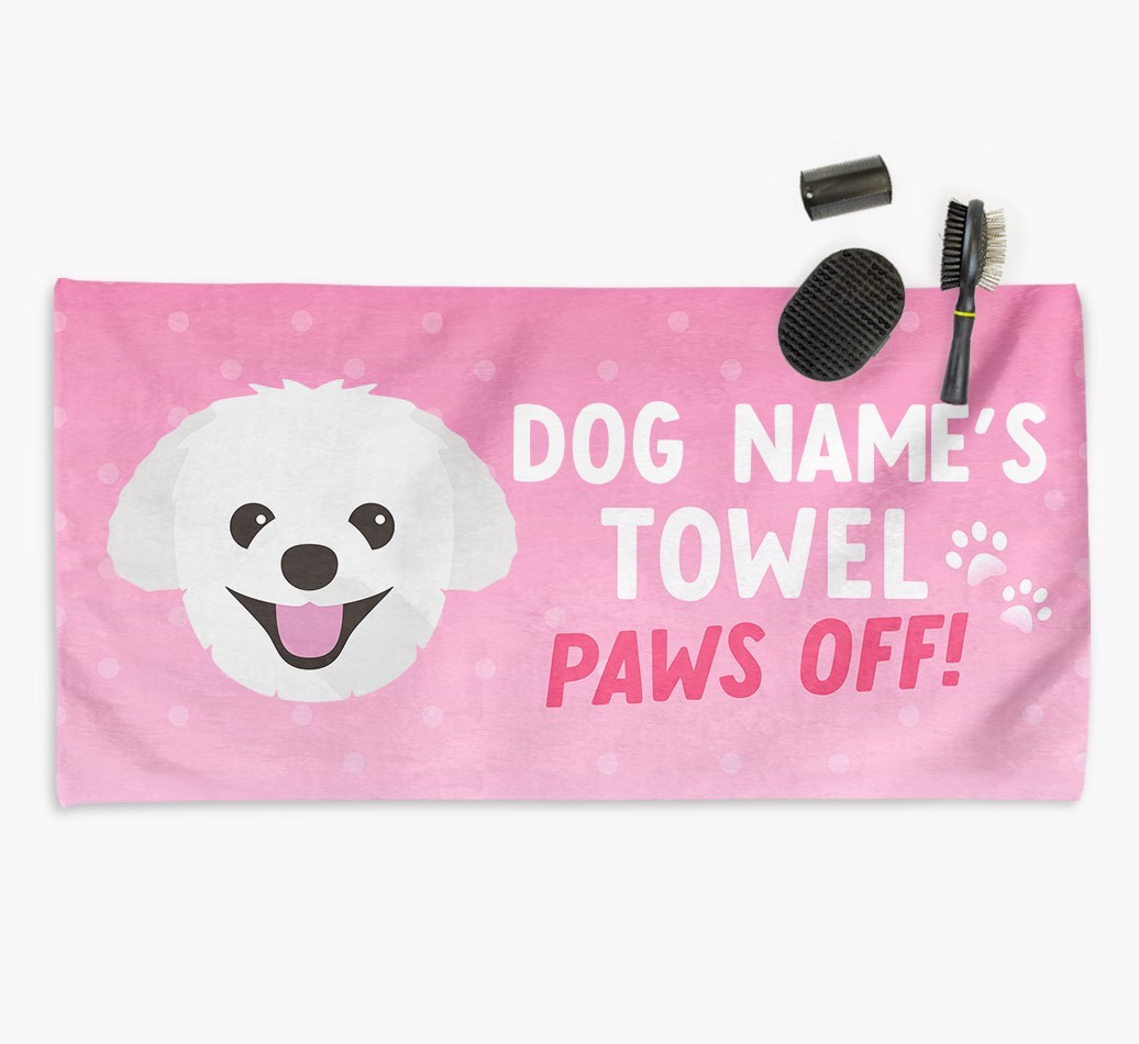 Perfect for messy pups and for pampering your Pomapoo at bathtime, this soft and absorbent towel is made for cleaning your mucky pup and drying them off in a flash. It's personalized with Pomapoo's name and icon and is printed with a message for everyone else to keep their paws off it!