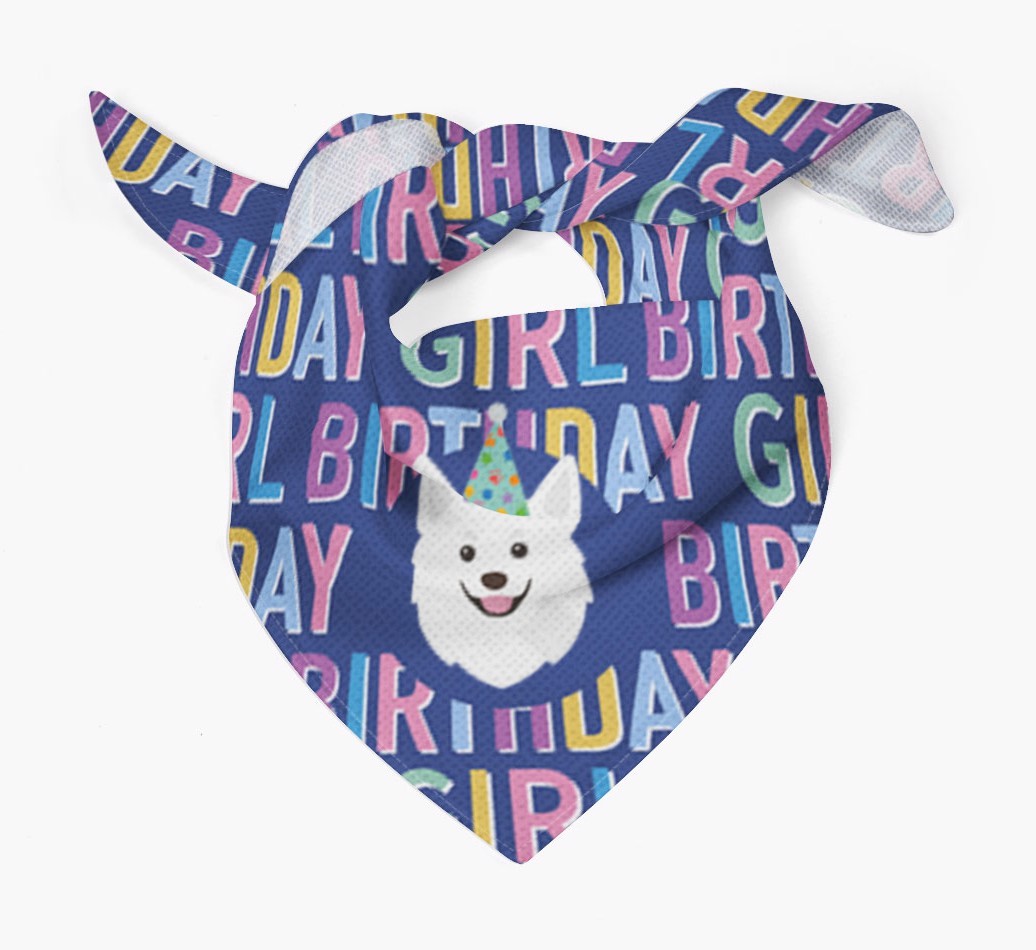 Featuring a text pattern that reads 'birthay girl' and personalized with Pomchi's cute icon (complete with a fun party hat), your Pomchi will look simply pawgeous on their special day when they're wearing this bandana.