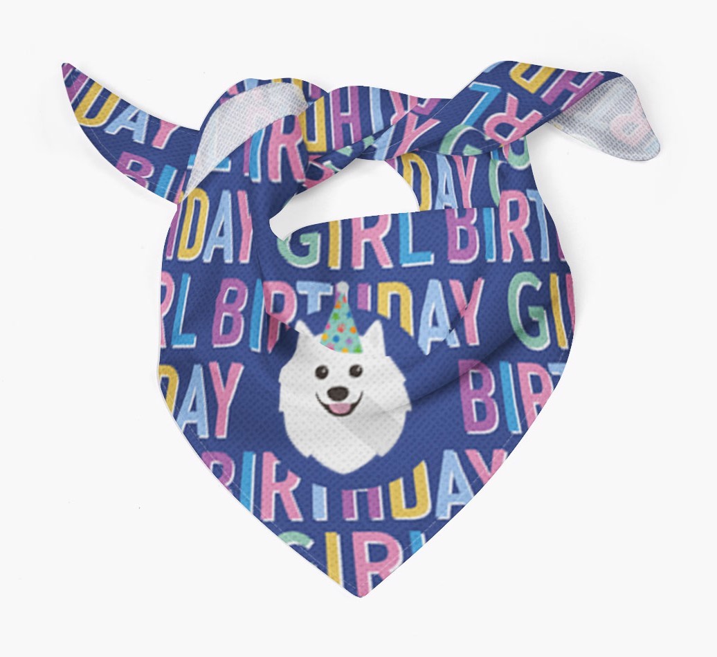 Featuring a text pattern that reads 'birthay girl' and personalized with Pomeranian's cute icon (complete with a fun party hat), your Pomeranian will look simply pawgeous on their special day when they're wearing this bandana.