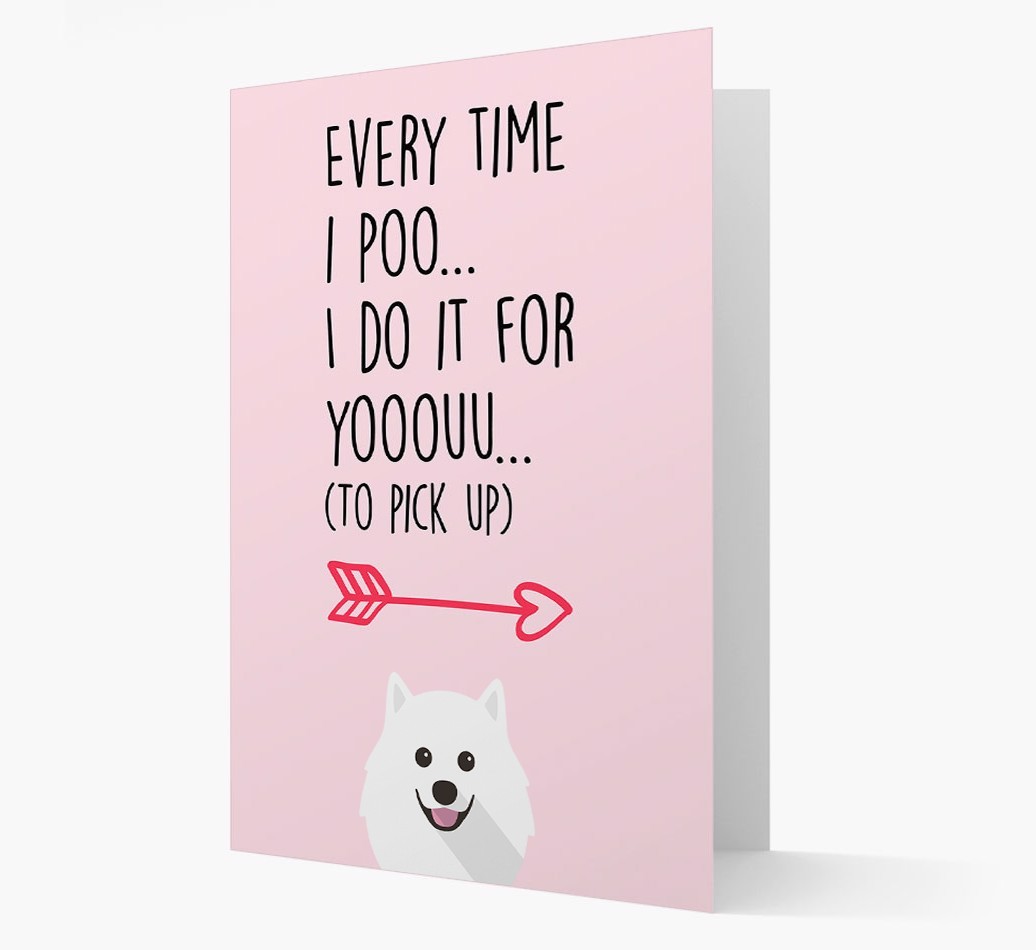Printed with the words ‘Everytime I poo… I do it for youuuuu (to pick up)’, this lyrical card is personalized with our famous Pomeranian icon – so it’s clear who’s been leaving you all those delightful ‘gifts’ to pick up!