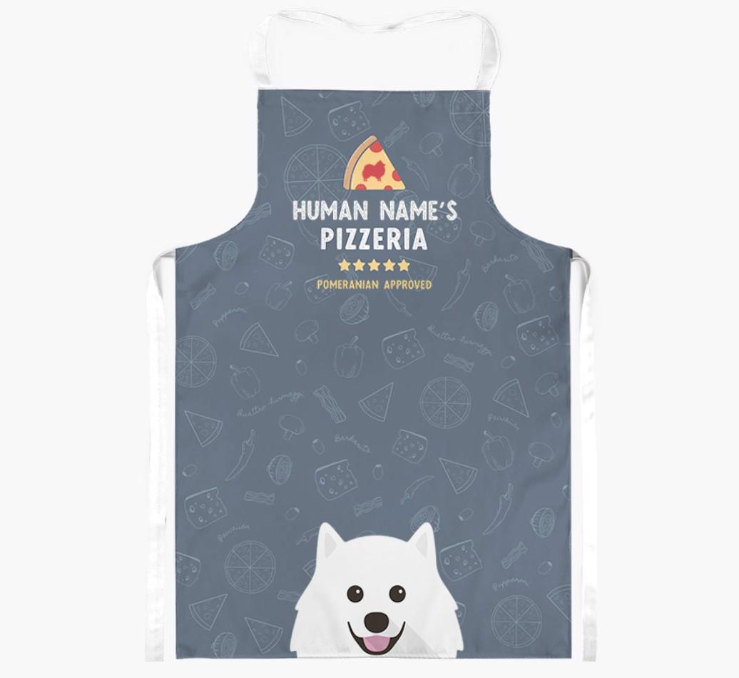 Featuring your furry friend's icon and lick of approval, plus your chosen human name, this apron is pawfect for anyone who considers themselves a pizza maestro in the kitchen. Available in a choice of 5 rustic colors, it'll make any Pomeranian lover happy.
