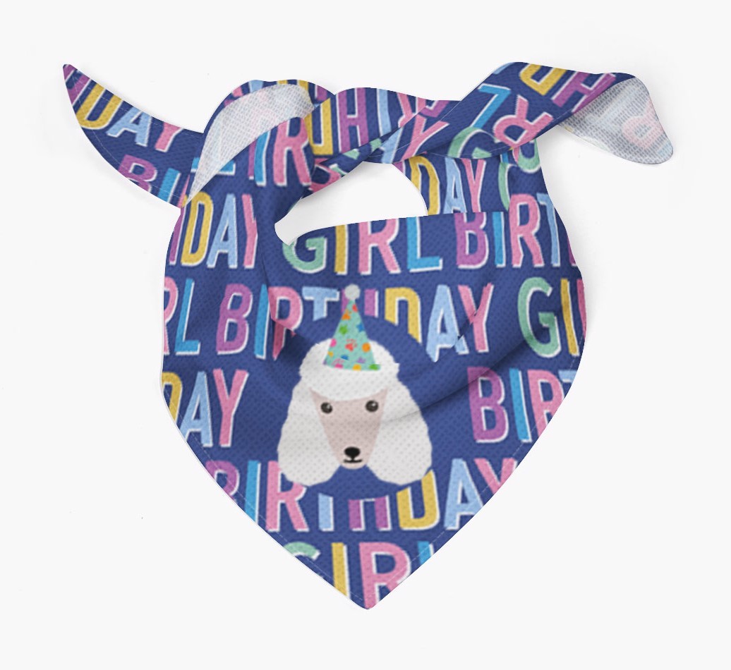 Featuring a text pattern that reads 'birthay girl' and personalized with Poodle's cute icon (complete with a fun party hat), your Poodle will look simply pawgeous on their special day when they're wearing this bandana.