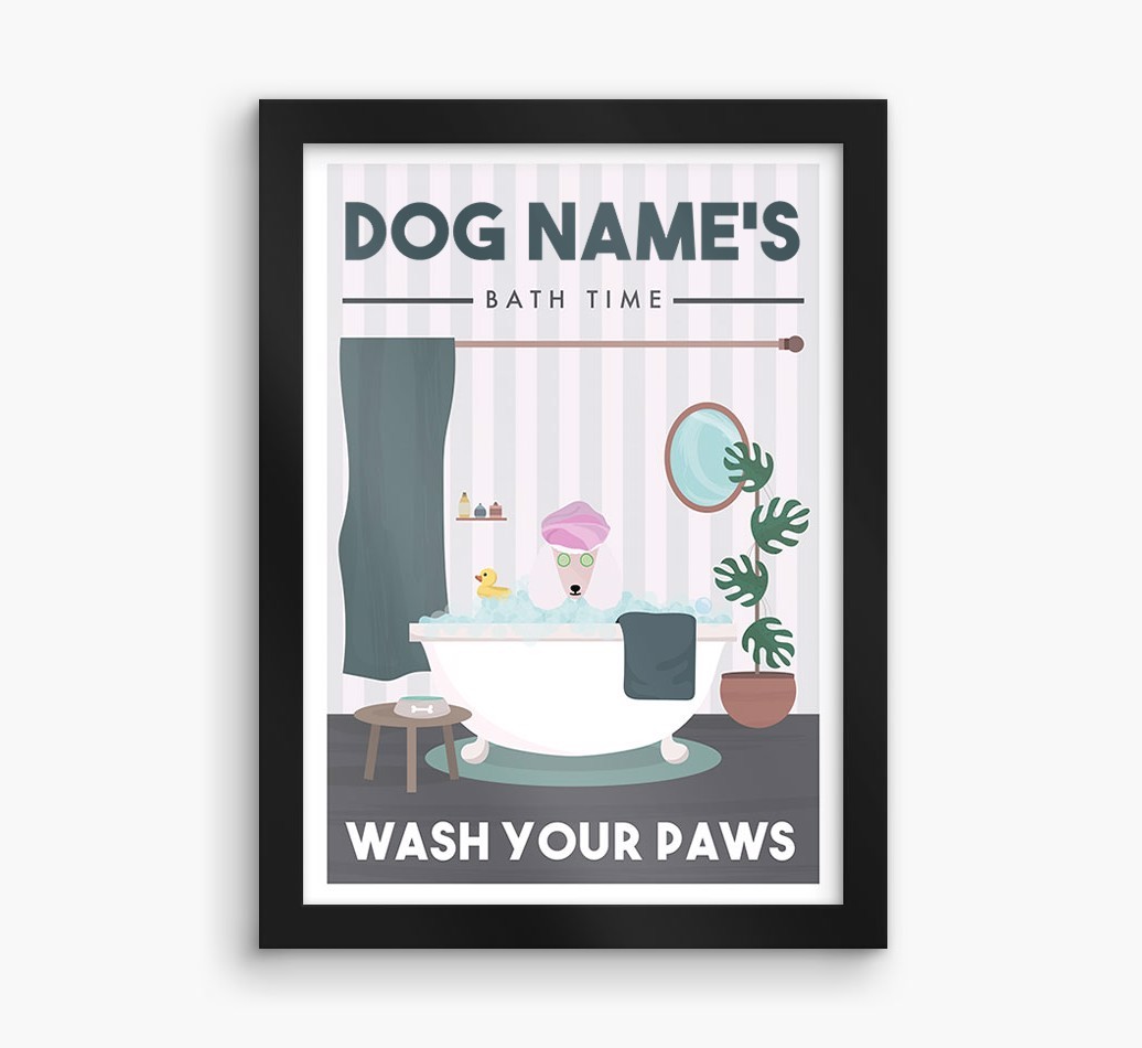 Featuring our mutterly relaxed Poodle yappicon in a stylish bathroom, this print will bring furresh clean vibes to your home and it’s also the pawfect reminder to ‘wash your paws’.