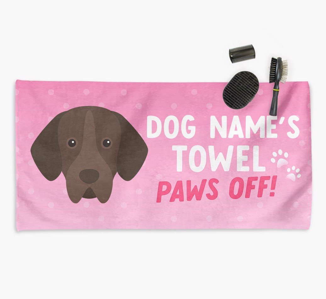Perfect for messy pups and for pampering your Pointer at bathtime, this soft and absorbent towel is made for cleaning your mucky pup and drying them off in a flash. It's personalized with Portuguese Pointer's name and icon and is printed with a message for everyone else to keep their paws off it!
