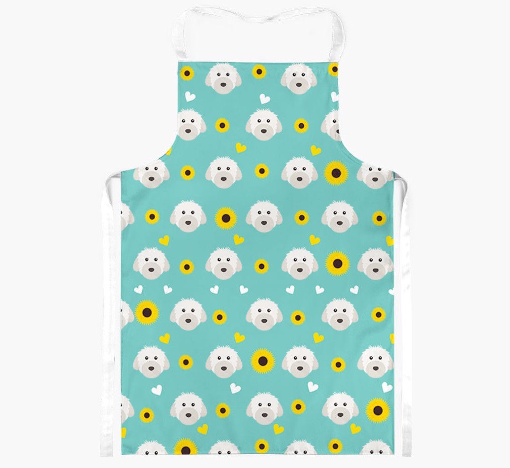This apron has a delightful sunflower and heart pattern, and best of all - it's personalized with Powderpuff Chinese Crested's face too! This cute and colorful apron is sure to put a smile on every dog lover's face.