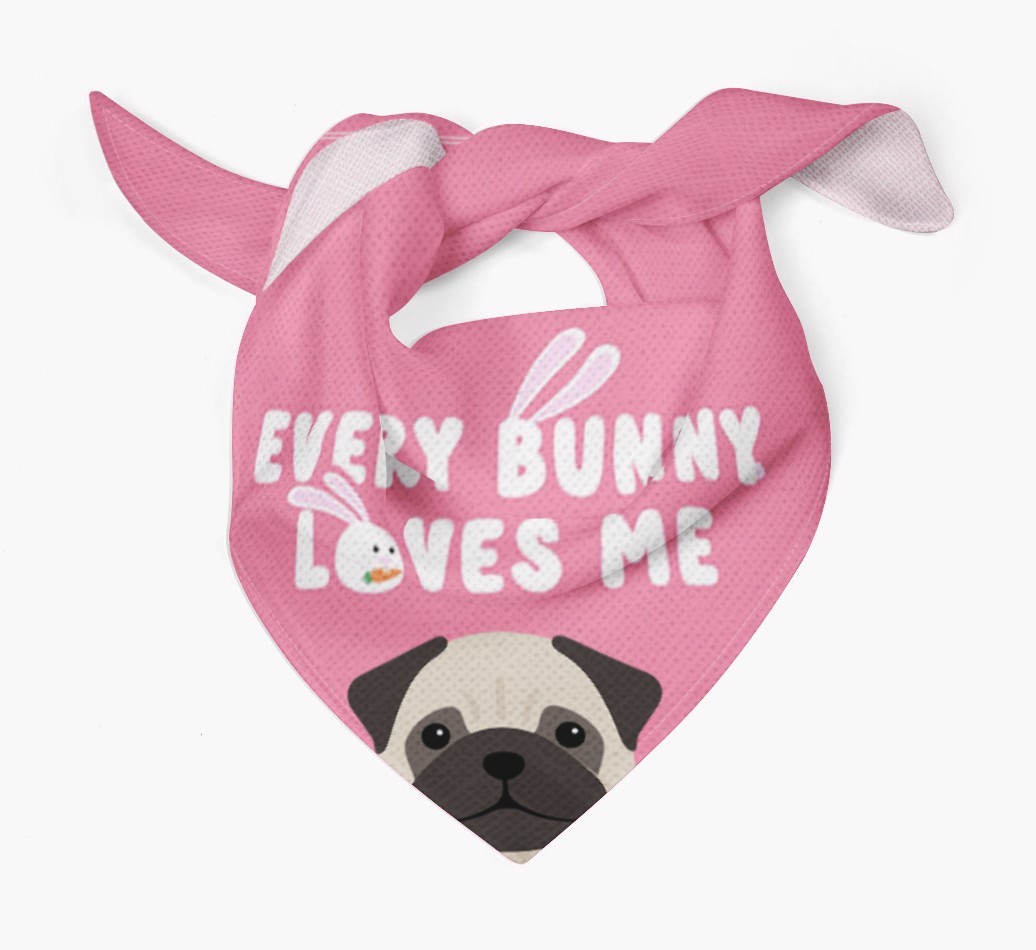 Tailored with the fabulous saying: 'Every Bunny Loves Me', this bandana is the perfect addition to your Pug's wardrobe! Available in four egg-ceptional colors and personalized with your Pug's icon, this is the perfect pawchase for Easter!