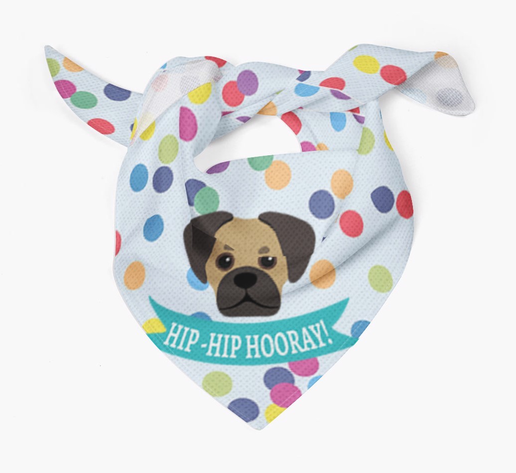 Featuring our famous Pugalier icon and the words ‘hip-hip hooray!’ printed upon a colorful confetti background, Your Pugalier is sure to look pawty ready wearing this bandana.
