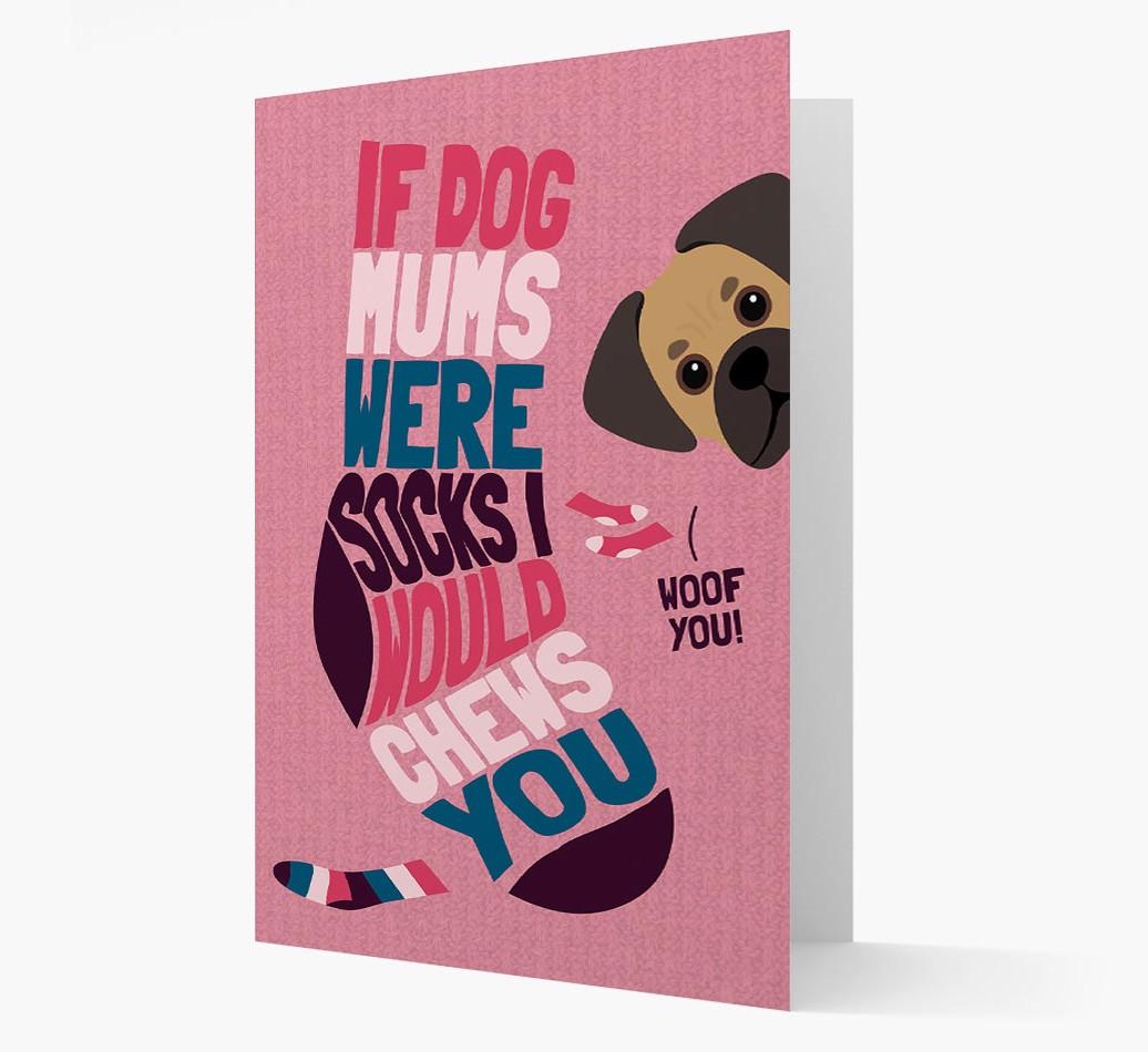 This comical card is pawfect for the Dog Mom who's pawrent to a sock-loving Pugalier.