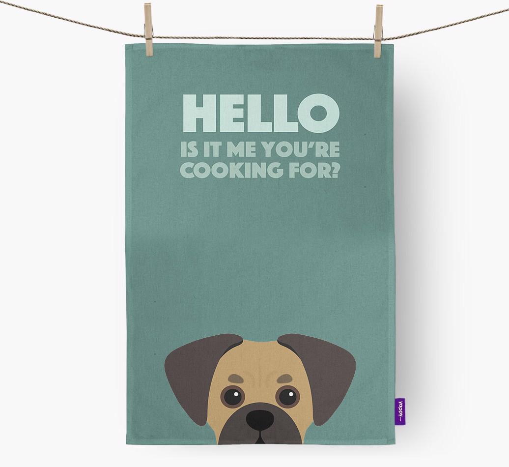 This gorgeous dish towel is sure to delight every Pugalier pawrent, especially as it stars their pup asking their favorite question, 'is it me you're cooking for?'