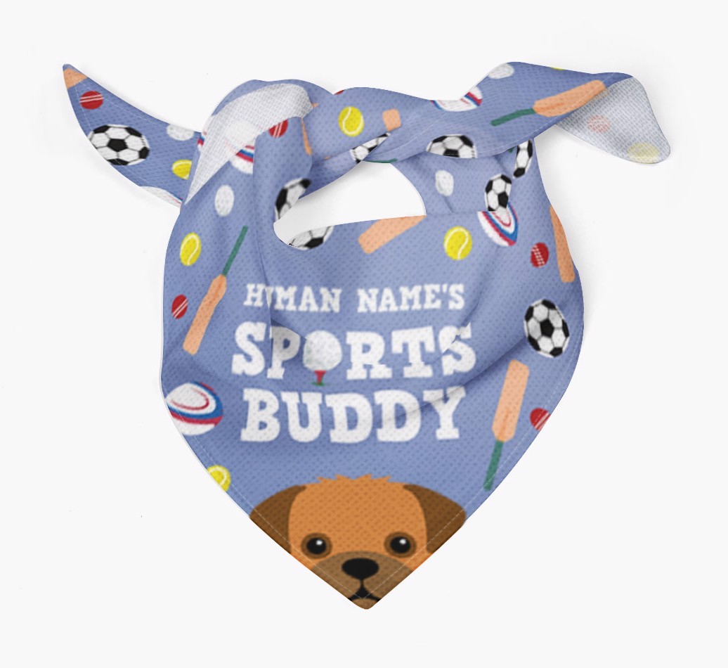 Featuring a background of footballs, soccer balls and more, this sporty design is made extra special with the addition of your Pugapoo's icon and their human's name.
