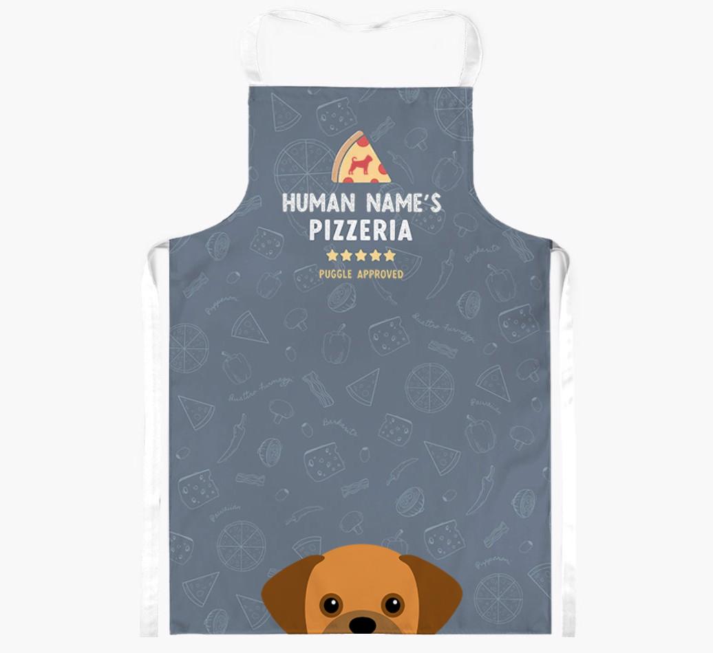 Featuring your furry friend's icon and lick of approval, plus your chosen human name, this apron is pawfect for anyone who considers themselves a pizza maestro in the kitchen. Available in a choice of 5 rustic colors, it'll make any Puggle lover happy.