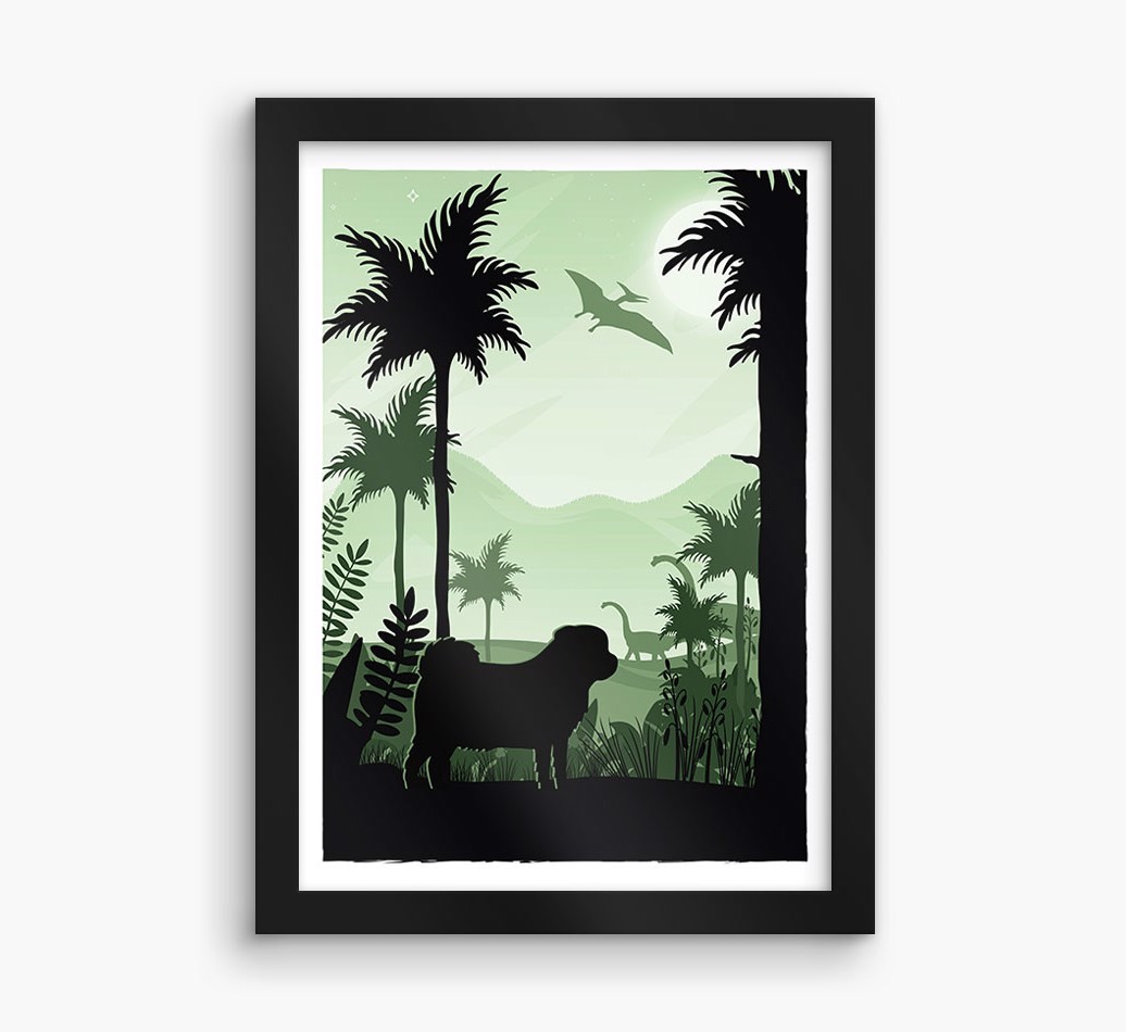 Join Pugzu on their adventure to the world that time forgot. Starring your Pugzu exploring a prehistoric jungle amongst roaming dinosaurs, this wall art is a fun and unique way to show off your brave pup on their most exciting adventure.