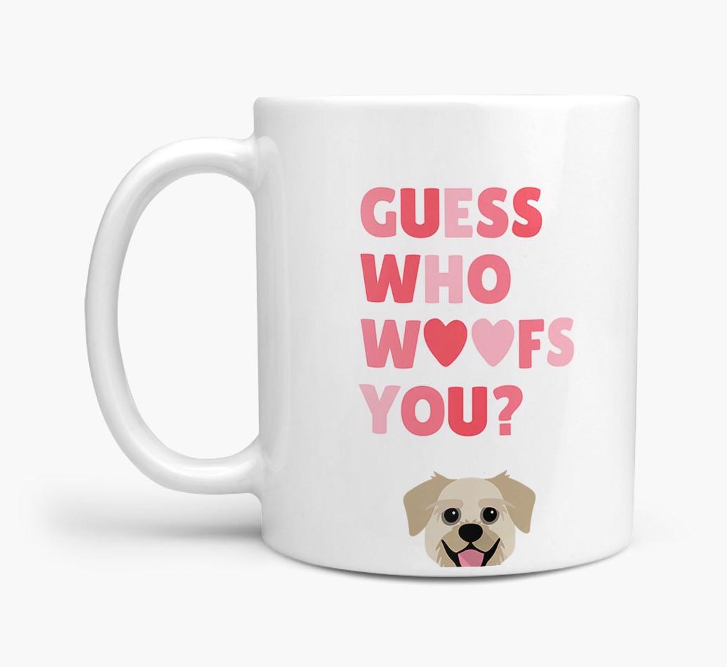 Personalized with Pugzu's cute face, this adorable mug is perfect for showing off the one who "woofs" you - how sweet!