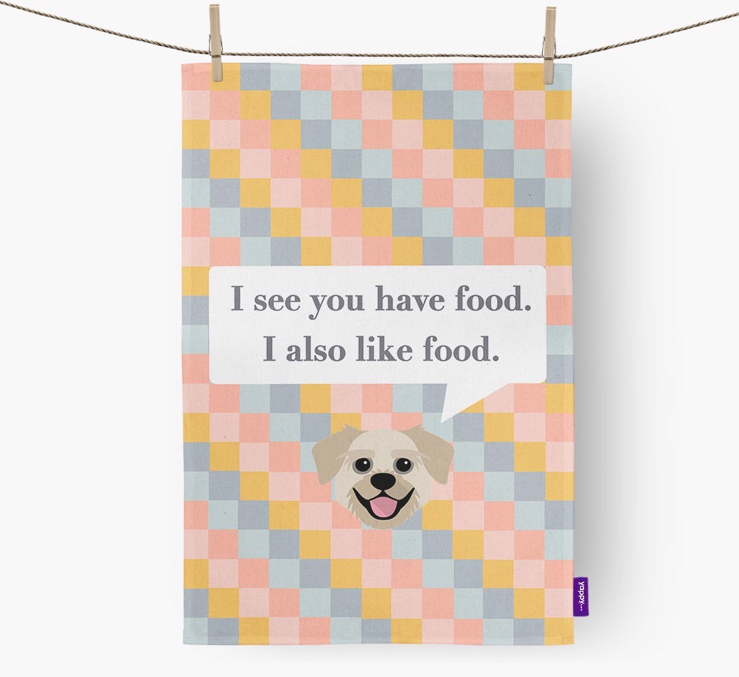If your Pugzu is a full time snack machine, this dish towel may be the ideal way to warn your guests.