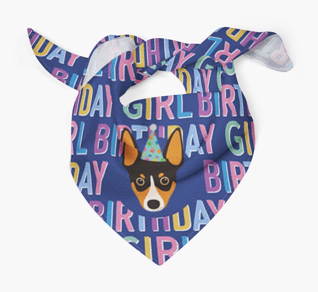 Featuring a text pattern that reads 'birthay girl' and personalized with Rat Terrier's cute icon (complete with a fun party hat), your Rattie will look simply pawgeous on their special day when they're wearing this bandana.