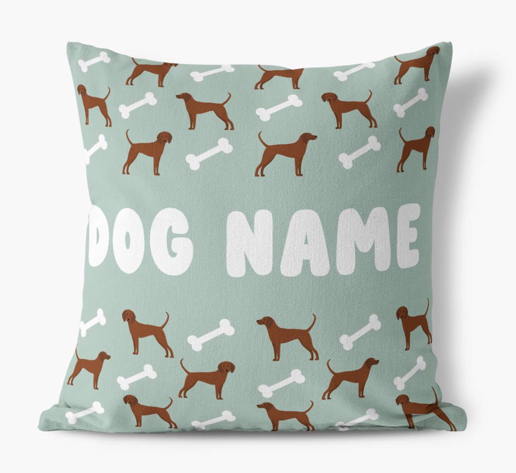 Personalized with Redbone Coonhound’s name against a background of Coonhound icons and bones, this gorgeous pillow is full of pawsonality.