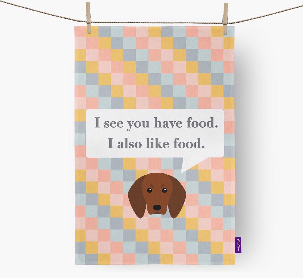 If your Redbone Coonhound is a full time snack machine, this dish towel may be the ideal way to warn your guests.