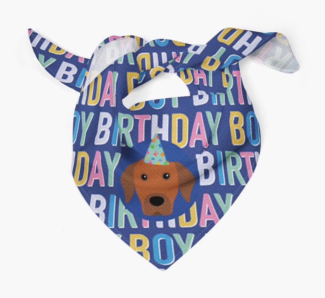 Featuring a colorful text pattern that reads 'birthay boy' and personalized with Rhodesian Ridgeback's cute icon (complete with a fun party hat), your Ridgeback will look simply pawgeous on their special day when they're wearing this bandana.