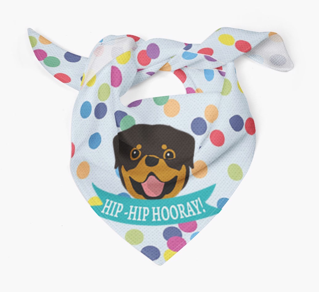 Featuring our famous Rottweiler icon and the words ‘hip-hip hooray!’ printed upon a colorful confetti background, Your Rottweiler is sure to look pawty ready wearing this bandana.