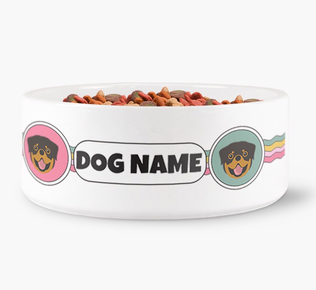 This jazzy dog bowl is sure to make waves with Rottweiler! With a colorful wavy pattern, this bowl is personalized with adorable Rottweiler icons and Rottweiler’s name to make it extra special.