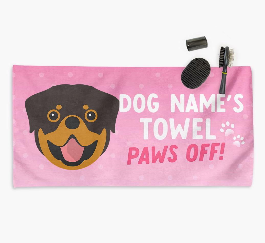 Perfect for messy pups and for pampering your Rottweiler at bathtime, this soft and absorbent towel is made for cleaning your mucky pup and drying them off in a flash. It's personalized with Rottweiler's name and icon and is printed with a message for everyone else to keep their paws off it!
