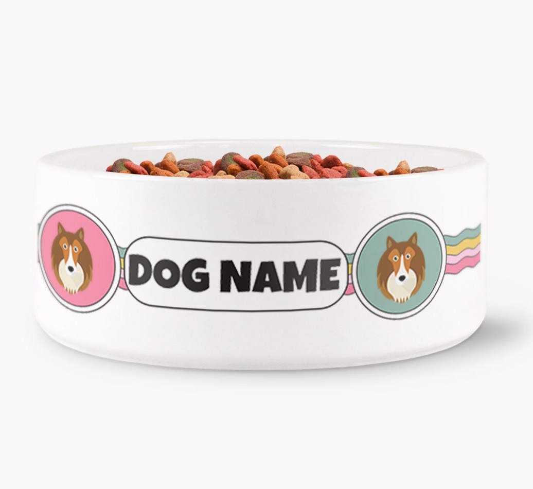 This jazzy dog bowl is sure to make waves with Rough Collie! With a colorful wavy pattern, this bowl is personalized with adorable Collie icons and Rough Collie’s name to make it extra special.