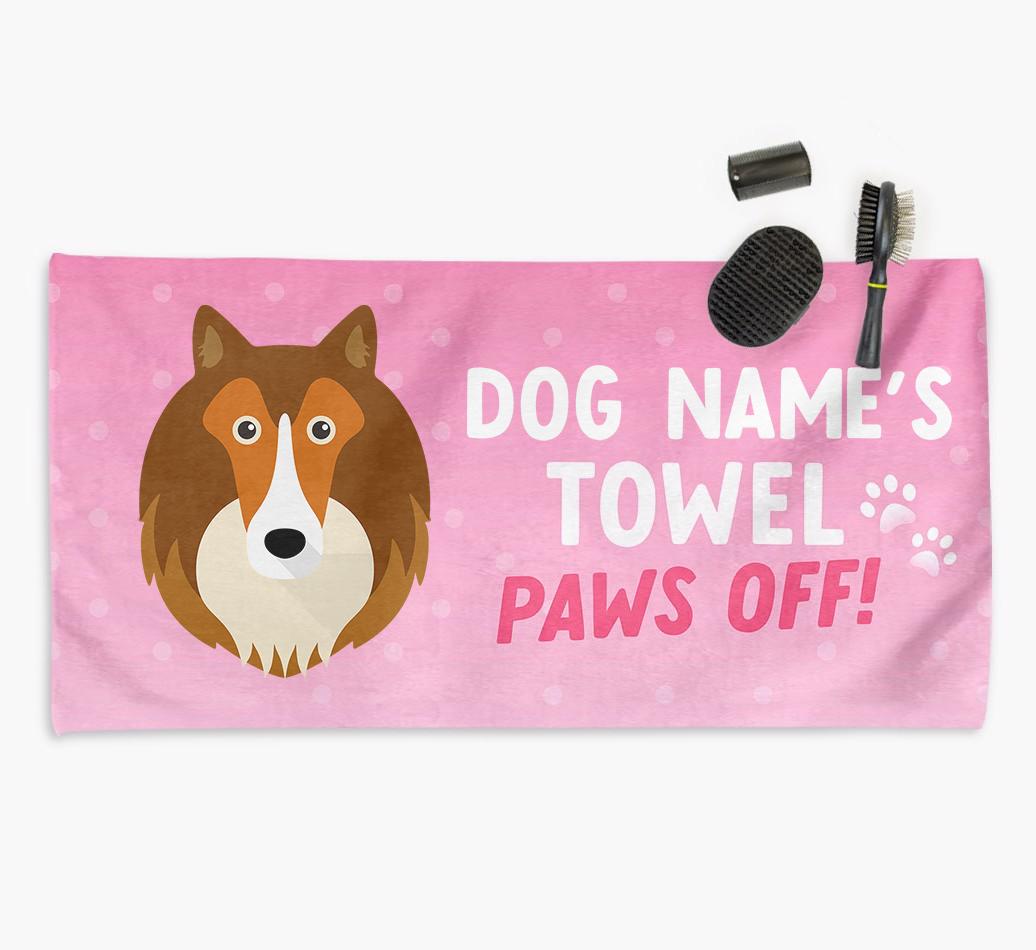 Perfect for messy pups and for pampering your Collie at bathtime, this soft and absorbent towel is made for cleaning your mucky pup and drying them off in a flash. It's personalized with Rough Collie's name and icon and is printed with a message for everyone else to keep their paws off it!