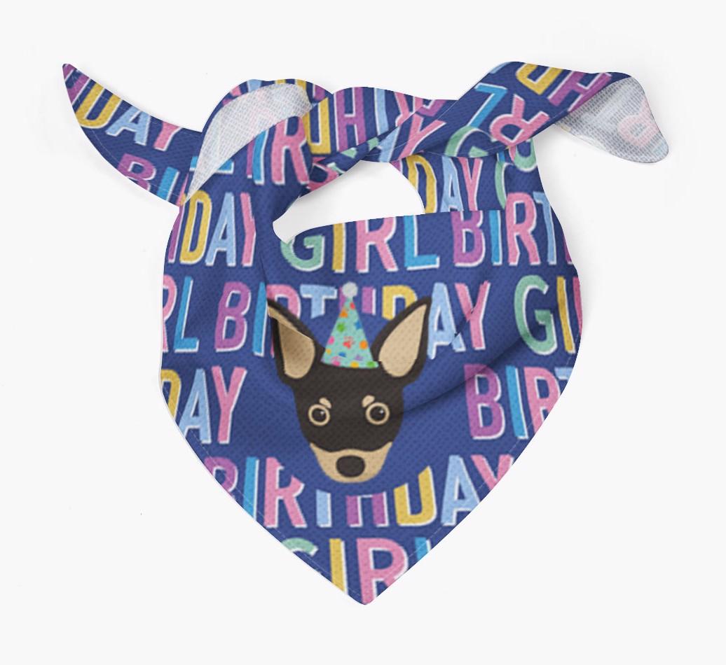Featuring a text pattern that reads 'birthay girl' and personalized with Russian Toy's cute icon (complete with a fun party hat), your Russian Toy will look simply pawgeous on their special day when they're wearing this bandana.