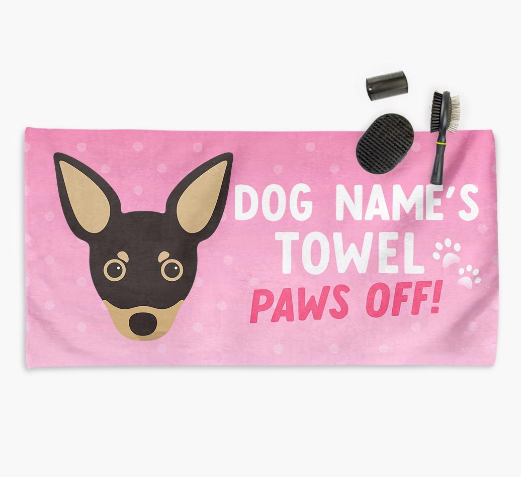 Perfect for messy pups and for pampering your Russian Toy at bathtime, this soft and absorbent towel is made for cleaning your mucky pup and drying them off in a flash. It's personalized with Russian Toy's name and icon and is printed with a message for everyone else to keep their paws off it!