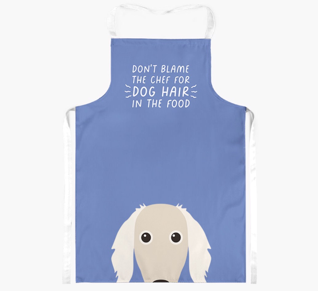 This funny apron will warn friends and family not to blame the chef for dog hairs in their food, they have Saluki to thank for that!