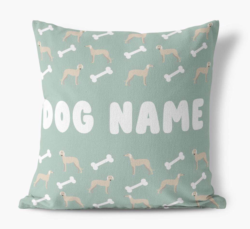 Personalized with Saluki’s name against a background of Saluki icons and bones, this gorgeous pillow is full of pawsonality.
