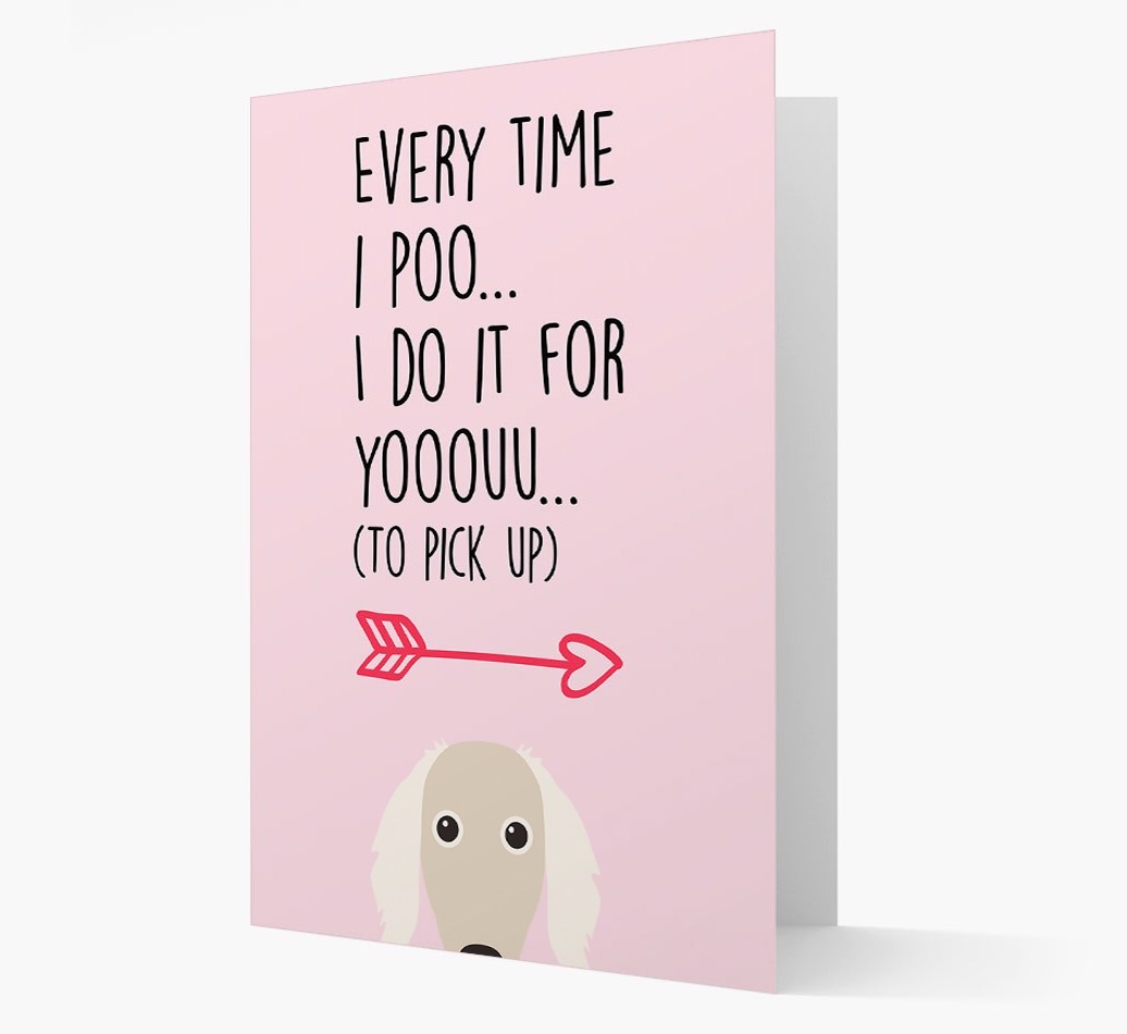 Printed with the words ‘Everytime I poo… I do it for youuuuu (to pick up)’, this lyrical card is personalized with our famous Saluki icon – so it’s clear who’s been leaving you all those delightful ‘gifts’ to pick up!