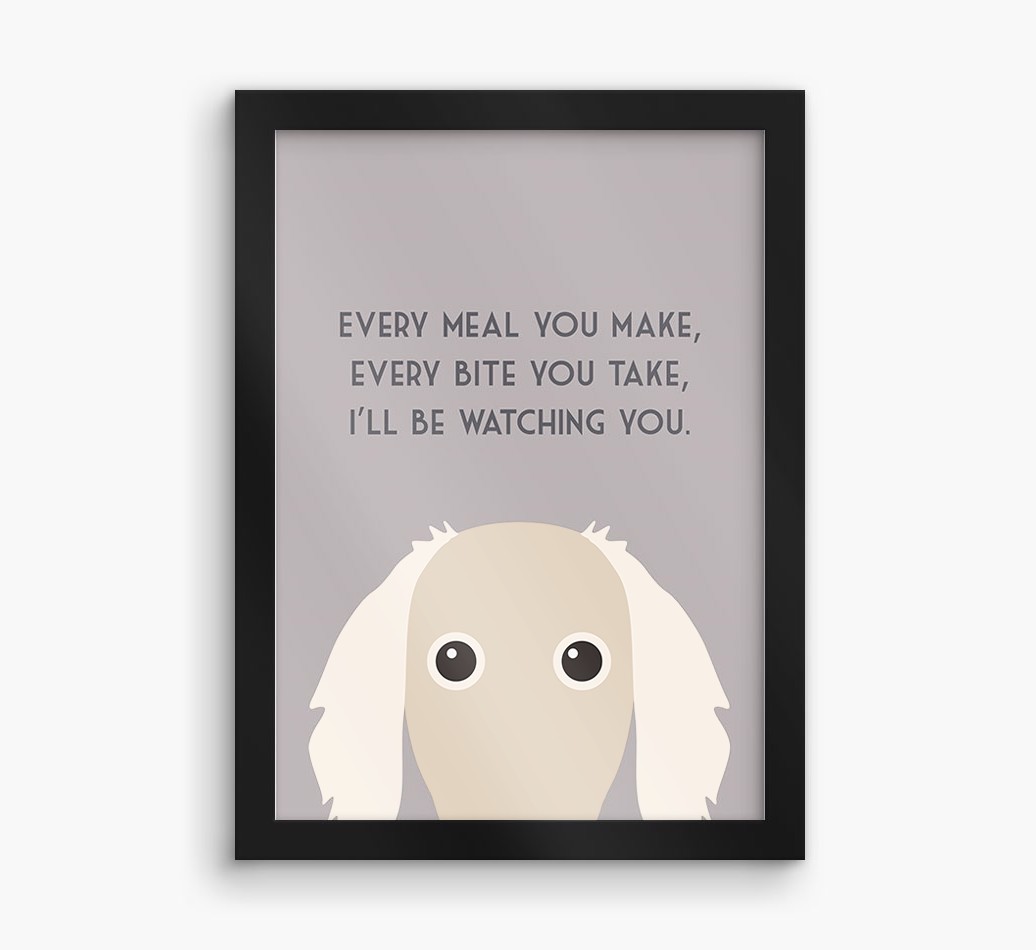 Printed with the words, ‘Every meal you make, every bite you take, I’ll be watching you’ and complete with our cute Saluki peeking from the bottom of the design, this artwork will look great on display in the kitchen or anywhere Saluki likes to watch you eat!