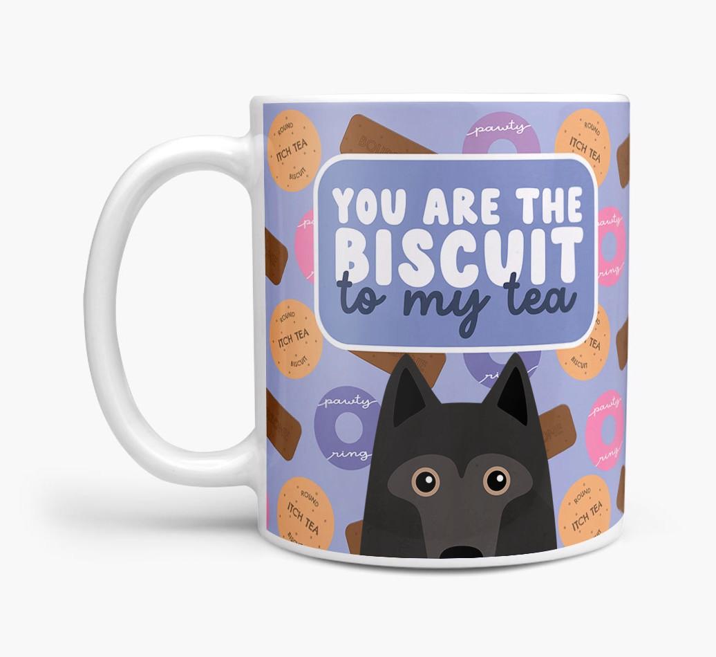 Featuring a cute biscuit motif paired with your Schipperke's adorable face, this mug is bound to be a firm favorite in every household.
