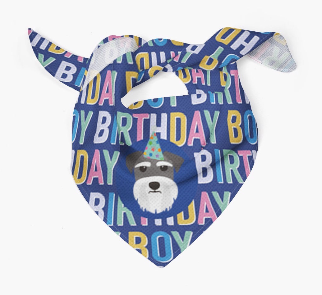 Featuring a colorful text pattern that reads 'birthay boy' and personalized with Schnauzer's cute icon (complete with a fun party hat), your Schnauzer will look simply pawgeous on their special day when they're wearing this bandana.