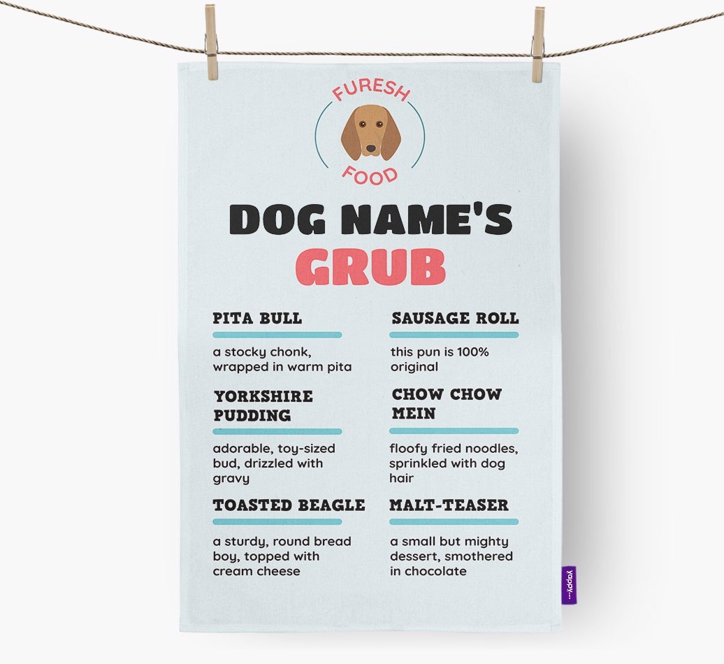 This dish towel design serves up plenty of doggy dishes that'll have you howling with laughter!