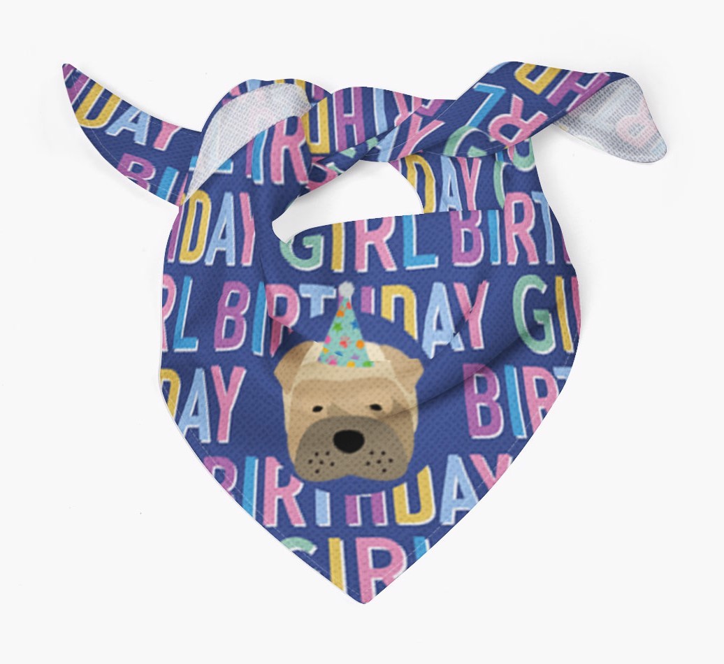 Featuring a text pattern that reads 'birthay girl' and personalized with Shar Pei's cute icon (complete with a fun party hat), your Shar Pei will look simply pawgeous on their special day when they're wearing this bandana.