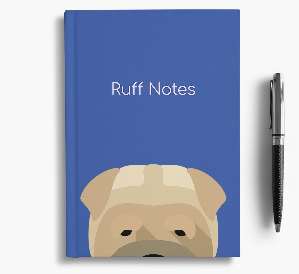 The front cover features our exclusive Shar Pei peeking icon and is printed with the words, ‘Ruff Notes’, whilst the back is printed with the words ‘Live. Laugh. Woof.’.